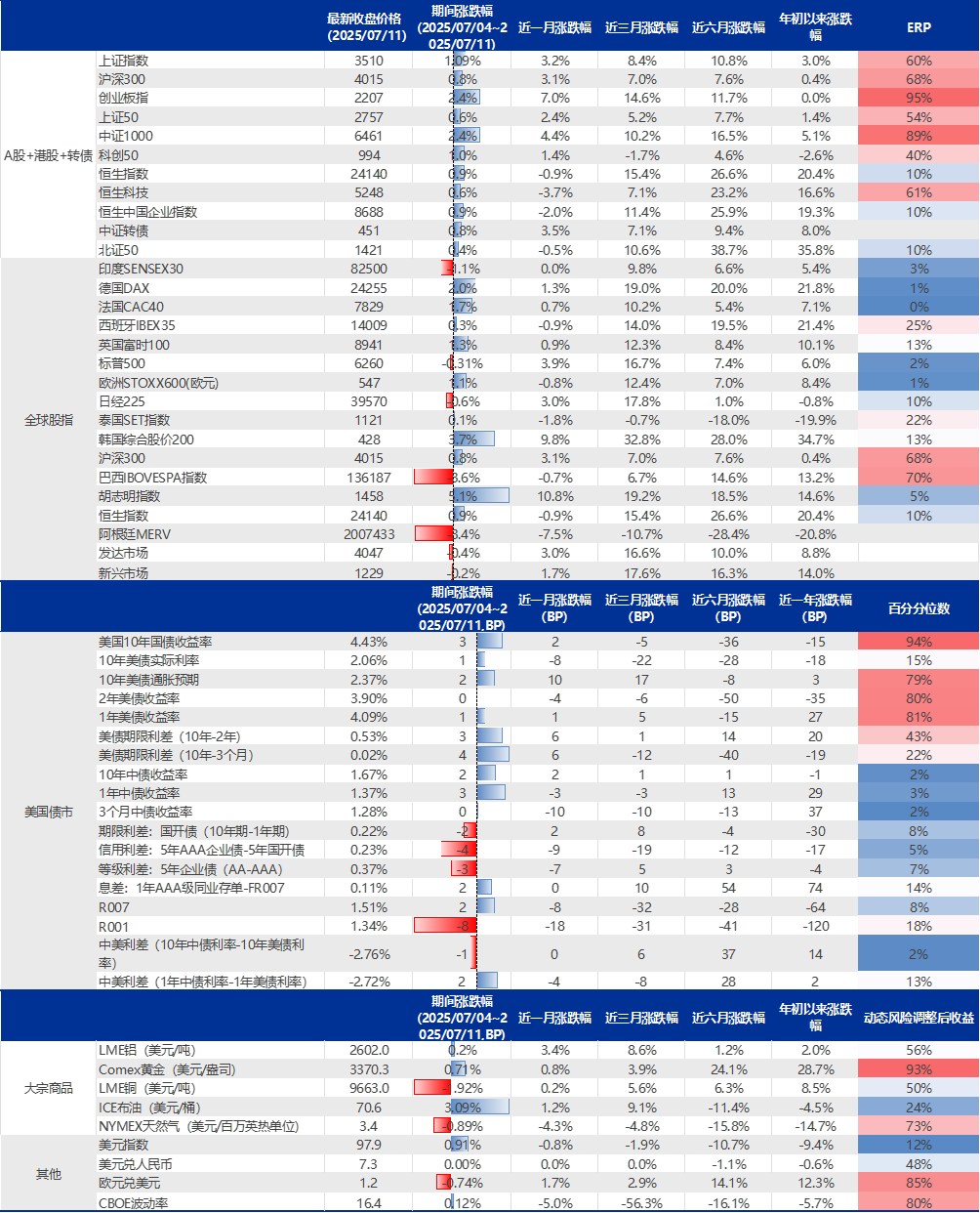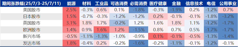 本周(20250704–20250711)7月7日,好意思国总统特朗普向日韩及南非等14国发送信函,宣称要启动征收“平等关税”。 特朗普称,新关税“十有八九”从8月1日启动奏效。关于将设定的新关税,特朗普说,“关税税率可能从60%、70%到10%、20%不等”。特朗普的手脚再次增多了众人交易的不细目性,本周商品类钞票涨幅靠前。1)利率方面,10Y好意思债收益率上升3 BPs来到4.43%,好意思元指数本周略有反弹,但仍在100以下,当今为97.9。2)权柄方面,本周亚洲股市涨幅靠前,具体来说,欧洲斯托克600 (1.15%)>恒生指数 (0.93%)>沪深300(0.82%)>新兴商场(-0.20%)>标普500 (-0.31%)>发扬商场 (-0.36%)>日经225(-0.61%)。3)商品方面,原油高涨3.09%,黄金高涨0.71%。
